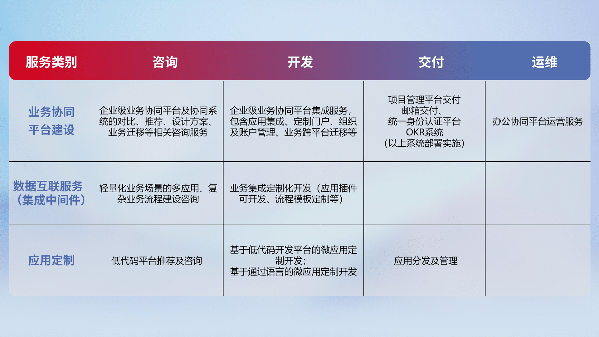 针对钉钉、、企微、、、IDaas等平台级产品提供产品的规划、、方案、、交付、、、、定制化开发等服务,,,,实现如统一协同办公、、、智能客户服务、、混合会议管理、、智能数据查询、、、、等业务场景,,,实现数字化转型。。。。