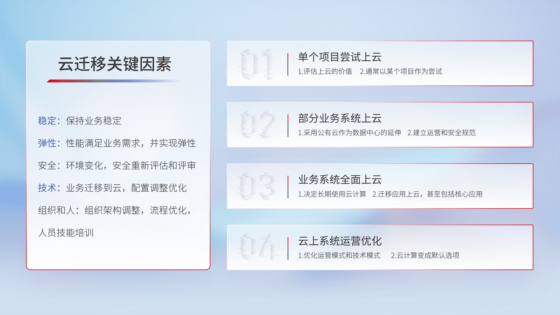 结合实际业务,,,,从规划设计、、、、云平台选型、、云原生改造、、、数据迁移、、、集成交付,,迁移全过程为客户识别最佳上云路径,,做好风险识别管理,,设计网络架构、、、、身份权限、、安全审计合规、、、操作审计、、、、日志审计、、监控告警策略、、、、多站点容灾设计等,,对云上基础设施进行整体规划,,提升IT治理水平,,,,以满足弹性、、、高可用、、、、高性能的需求。。。。