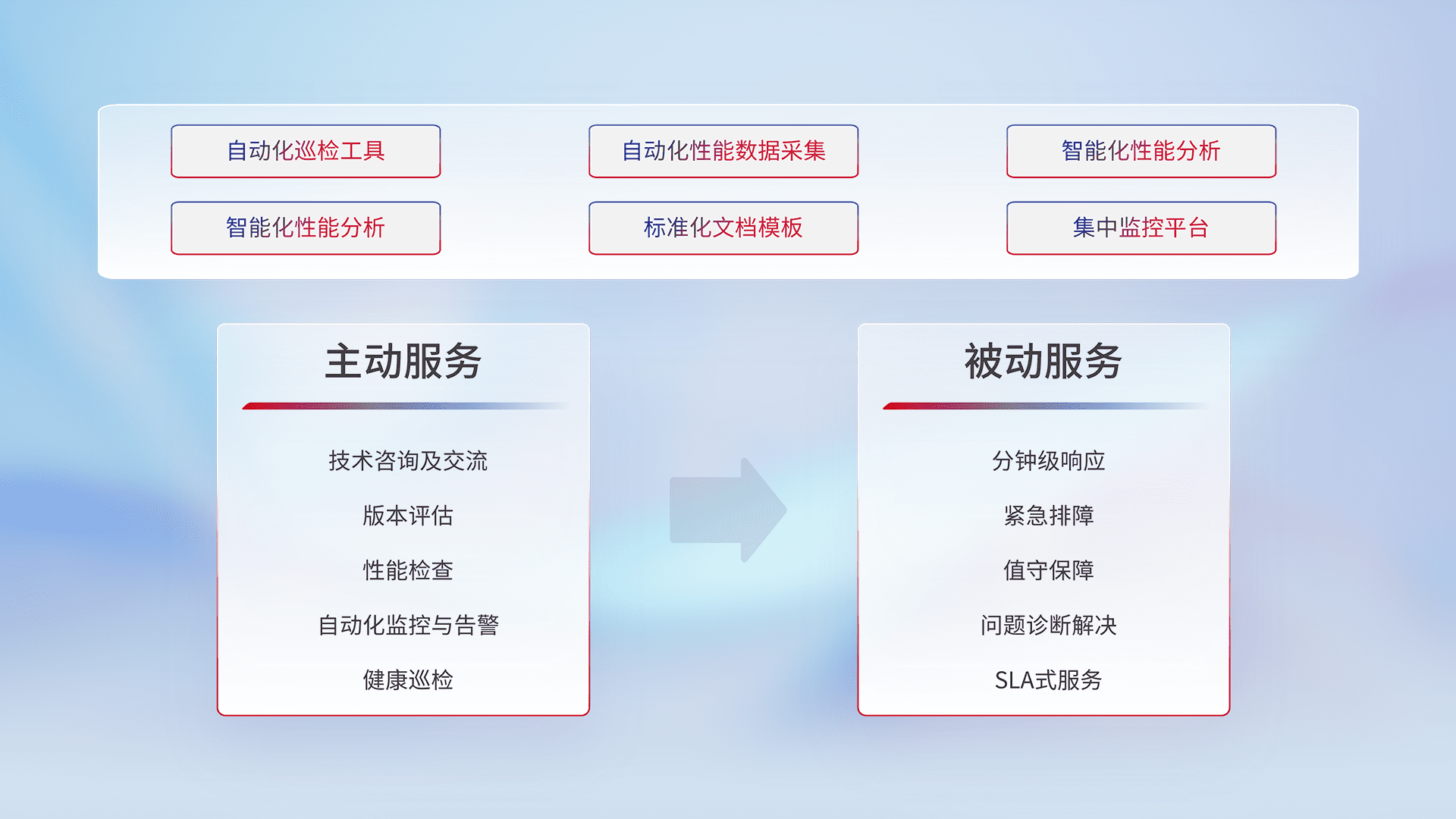智能化工具和标准化文档,,,,保障服务质量,,,提供主动服务(包含技术咨询、、、版本评估、、、性能检查、、、自动化监控与告警、、健康巡检)和被动服务包含(分钟级响应、、、紧急排障、、值守保障、、、、问题诊断解决、、、、SLA服务)。。